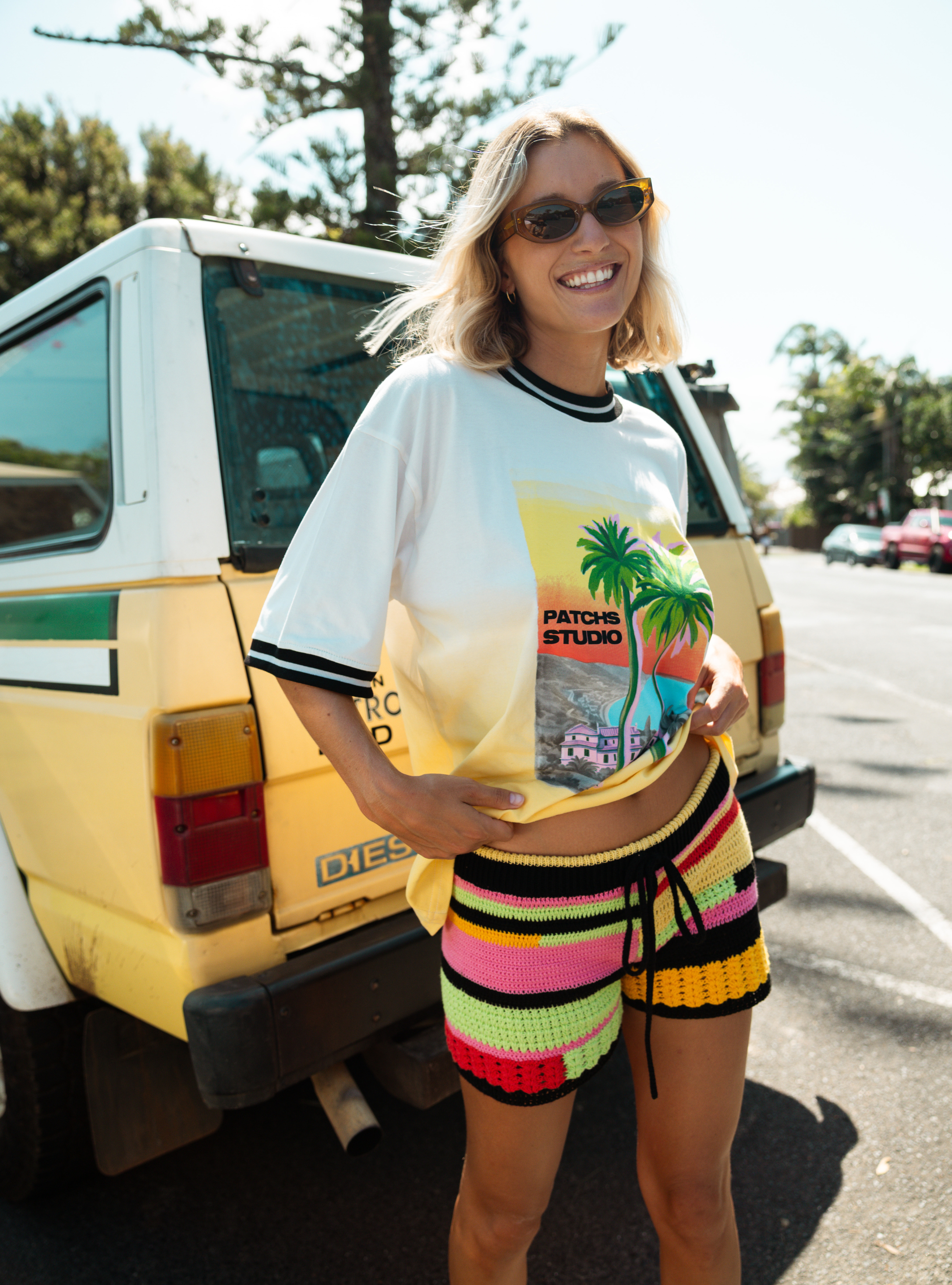 Introducing our Crochet Shorts, crafted from a vibrant mix of multicoloured threads and a variety of intricate stitch techniques. The waistband features a drawstring for an adjustable, comfortable fit. A beautiful display of craftsmanship, each pair is thoughtfully handmade by a collective of skilled women artisans, taking two days to knit.