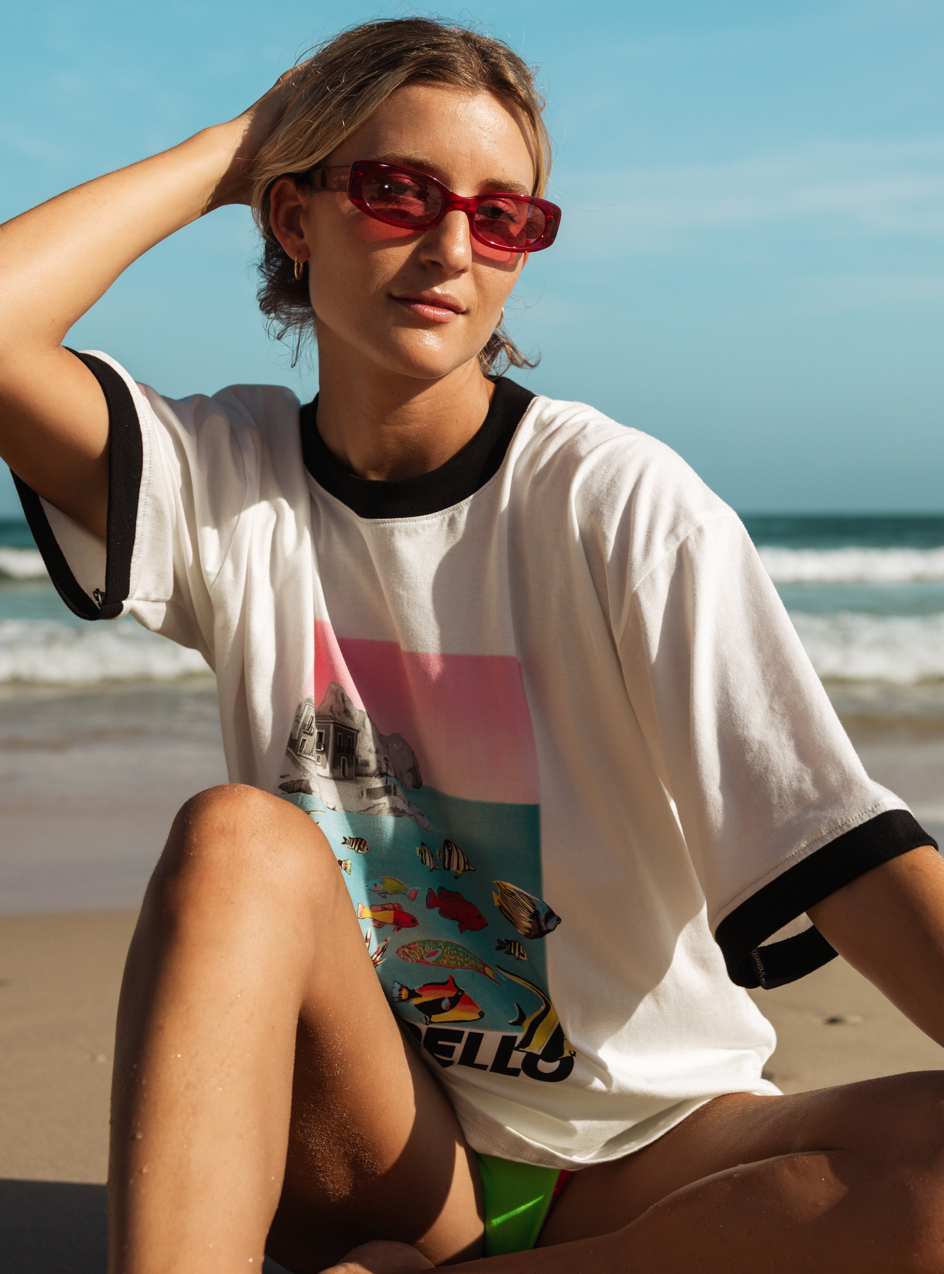 The Scopello Tee showcases a vibrant sea-life print inspired by Sicilian summer snorkelling. Finished with a bold black ribbed neck and matching cuffs, it’s handcrafted by skilled artisans using soft Peruvian cotton. This relaxed-fit tee delivers a balance of standout artistic detail and effortless, everyday comfort.
