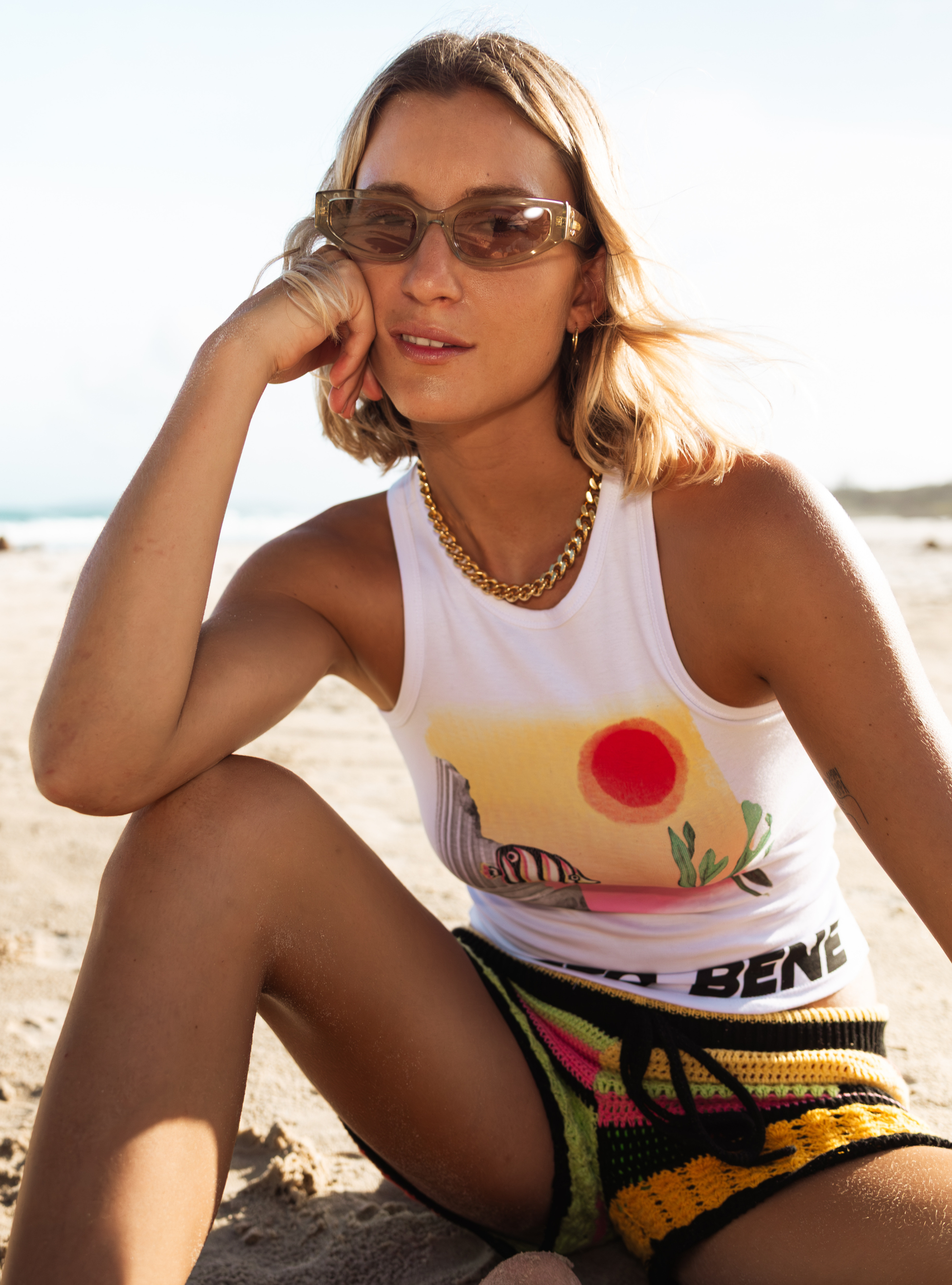 Introducing our Tank Tops, featuring a vibrant sea-life print inspired by bright Sicilian summer snorkelling. Designed in a fitted silhouette with elasticated cotton for easy, comfortable movement, each piece is handcrafted by skilled artisans using soft Peruvian cotton. These tanks deliver the perfect balance of standout artistic detail and effortless everyday comfort.